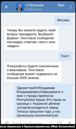 Вопросов о кислотных выбросах в Армянске в этом году российскому президенту задали многие жители северного Крыма.