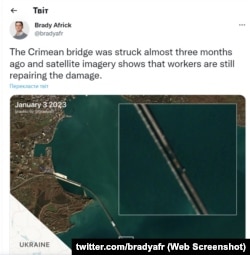 Мост через Керченский пролив до сих пор не восстановлен, утверждает аналитик отдела исследований внешней и оборонной политики Американского института предпринимательства Брэди Африк. К таким выводам он пришел, анализируя спутниковые снимки моста, сделанные в начале января 2023 года.