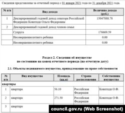 По итогам 2014 года, когда Ольга Ковитиди была впервые назначена сенатором от Крыма в Совете Федерации РФ, она задекларировала более трех миллионов рублей годового дохода. А в 2021 году на этом же посту она уже показала доход в 15 миллионов рублей за год.