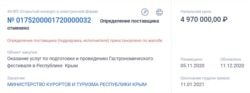 Тендер по подготовке и проведению гастрономического фестиваля на полуострове стоимостью 4,9 миллиона рублей в ведомстве объявили в конце прошлого года. Подрядчика услуг должны были определить в январе. Однако процедура на данный момент приостановлена по жалобе одного из участников конкурса.