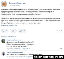 В керченских группах введенный в Крыму «средний уровень реагирования» почти не обсуждают, но некоторые комментарии, все же, заслуживают внимания.