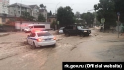 Одну из пострадавших спасли сотрудники полиции. На фото, обнародованном пресс-службой крымского главка МВД России, видно, что девушку уносило потоком воды на улице.