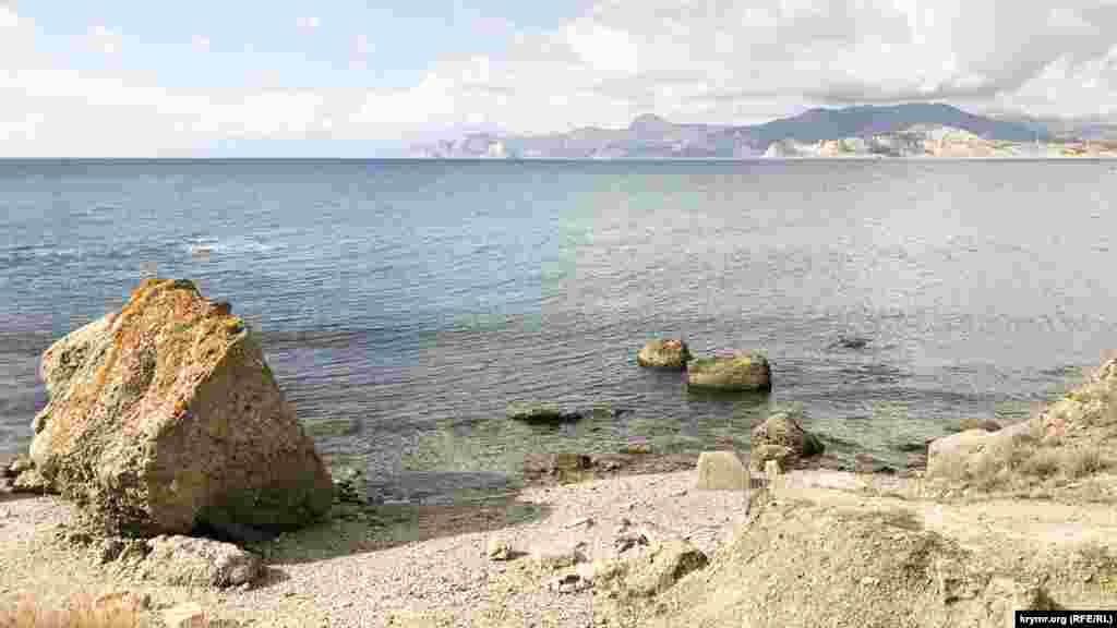 Труднодоступный пляж на мысе Меганом в бухте Капсель с видом на горы неподалеку от Судака и Нового света.
