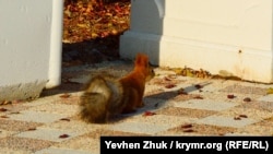 У колонны – рыжая белка, здесь их очень много. Посетители белок не обижают и подкармливают, но эта насторожилась, хотя я фотографирую с большого расстояния.
