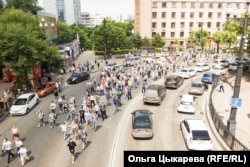 Выходили к протестующим и представители краевого правительства: пресс-секретарь губернатора Надежда Томченко и первый зампред регионального правительства Владимир Хлапов. Они хоть и призывали разойтись: мол, коронавирус же, но поблагодарили людей за поддержку губернатора. А после этого перед собравшимися выступили все желающие – в общей сложности таких набралось около 10 человек. Некоторые даже не представлялись. В основном ораторы задавались одними и теми же вопросами – почему убийства 16-летней давности расследовались так долго, почему только сейчас, когда Фургал стал губернатором, его арестовали? Впрочем, из-за постоянного скандирования лозунга "свободу!" и звука клаксонов проезжавших мимо машин, водители которых таким образом поддерживали собравшихся, слова выступавших можно было разобрать с трудом, не помогал даже мегафон.