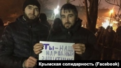 Возле здания подконтрольного Кремлю Киевского райсуда Симферополя проходит флешмоб в поддержку задержанного российскими силовиками адвоката Эмиля Курбединова.