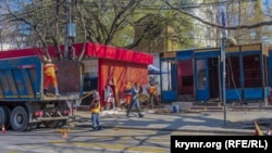 Рабочие симферопольского предприятия «Город» продолжают демонтаж признанных российскими властями города торговых объектов, которые не являются капитальными строениями.