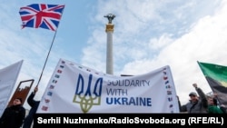 В центре Киева прошла акция в поддержку Украины, которая противостоит российской агрессии и находится под угрозой нового вторжения.