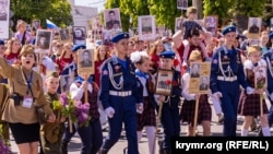 После парада началось шествие «Бессмертного полка» от площади Ленина до Вечного огня в парке имени Гагарина. Корреспондент Крым.Реалии отмечает, что акция вышла более массовой, чем парад. В ней впервые взяли участие отдельные местные жители, дети которых как военнослужащие российской армии погибли во время продолжающихся военных действий в Украине. На акцию они пришли с портретами своих погибших родственников.