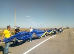 Волонтеры утром в субботу прибыли на КПВВ «Чонгар» на админгранице Крыма с Херсонской областью. Здесь они рассказали, что флаг Украины сшила жительница Славянска Татьяна Маник. Как отметили участники акции, они хотят показать, что «о жителях Крыма помнят, борьба продолжается».