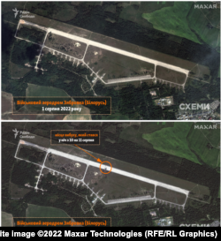 Компания Maxar Technologies обнародовала спутниковые снимки военного аэродрома «Зябровка» в Беларуси, расположенного ориентировочно в 25 километрах от украинской границы. На аэродроме дислоцированы силы Российской Федерации. На снимке, который есть в распоряжении «Схем» (Радіо Свобода), можно увидеть место взрыва, который произошел там в ночь с 10 на 11 августа.