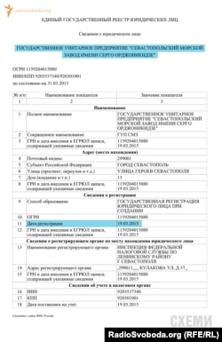 Согласно данным российского реестра, украинское предприятие зарегистрировали как собственность России 19 марта 2015 под названием Государственное унитарное предприятие «Севастопольский морской завод», сообщает программа Первого национального и Радіо Свобода «Схемы».