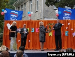 Как сообщает корреспондент Крым.Реалии, на летней сцене, украшенной партийными флагами «Единой России», выступали коллективы культурной самодеятельности.