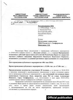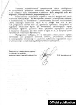 «Название, цели и организатор мероприятия при этом не называются. Также в ответе администрации города Симферополь предложено иное место проведения пикета «Будущее детям», его предложено перенести в парк им. Ю.А. Гагарина возле скульптурной композиции «Три грации», – рассказал Илья Большедворов.