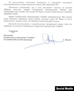 В письме подчеркивается, что в ведомстве расследуют уголовное производство по факту совершения судьями крымских судов государственной измены, и в ходе досудебного расследования установили, что 24 марта 2014 года Чернобук «во время интервью высказывался по вопросу перехода работы судей на применение российского законодательства, в дальнейшем читал судьям лекции по соответствующей тематике».