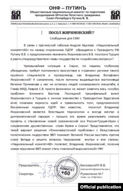 Активисты российской организации «Национальный комитет +60» обратились к президенту России Владимиру Путину с просьбой назначить на пост посла в Турции Владимира Жириновского. В своем обращении, текстом которого располагает Крым.Реалии, активисты просят назначить лидера партии ЛДПР «в ранге спецпредставителя главы государства по «сирийскому вопросу».