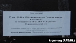 В субботу, 27 мая, в Севастополе пройдет митинг протеста против российского проекта генерального плана города. Об этом Крым.Реалии сообщили представители инициативных групп, организующих митинг.