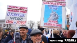 На площади имени Ленина в Симферополе 3 февраля прошел митинг, посвященный 75-летию Сталинградской битвы во Второй мировой войне. Участники митинга принесли с собой плакаты, флаги советского периода, государственные символы России, некоторые были одеты в военную форму Красной армии, пришли на акцию и девушки в сарафанах и кокошниках.
