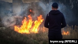 В Симферополе вечером 1 апреля на объездной дороге напротив торгово-развлекательного центра FM между заправкой и жилым микрорайоном загорелось камышовое поле.