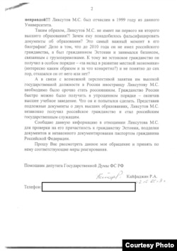 Связь между гражданством и образованием Максима Ликсутова прямая: он мог стать гражданином России в упрощенном порядке как выпускник российского вуза. В открытых источниках, в том числе в публикациях в СМИ, указано, что Ликсутов окончил два учебных заведения: Российскую экономическую академию им. Плеханова и Калининградский технический университет. Но в письме, которое Горбатов передал Кайфаджяну, утверждалось, что Ликсутов на самом деле не получал дипломов указанных вузов, а поэтому и гражданство России получил незаконно. Также там было сказано, что в Плехановскую академию по программе второго высшего образования Ликсутов поступил на основании диплома еще одного вуза – Московского государственного социального университета, в котором на самом деле не учился. Копией своего обращения на имя начальника ГУЭБиПК МВД России Дениса Сугробова Кайфаджян поделился с Радио Свобода.