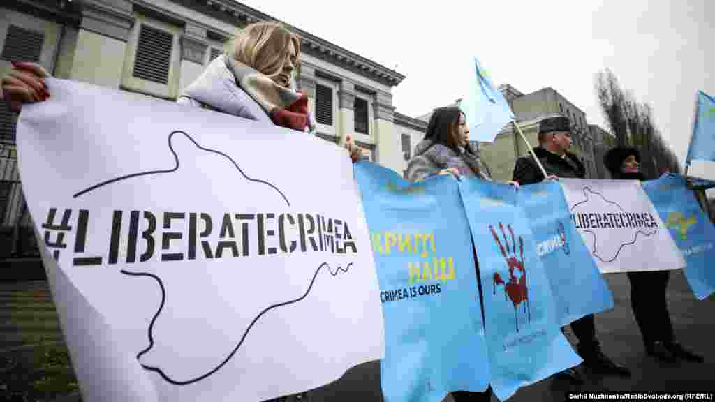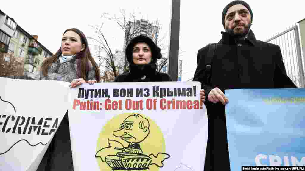 На плакатах у активистов были надписи «Крым будет свободным», «Путин, вон из Крыма» и другие