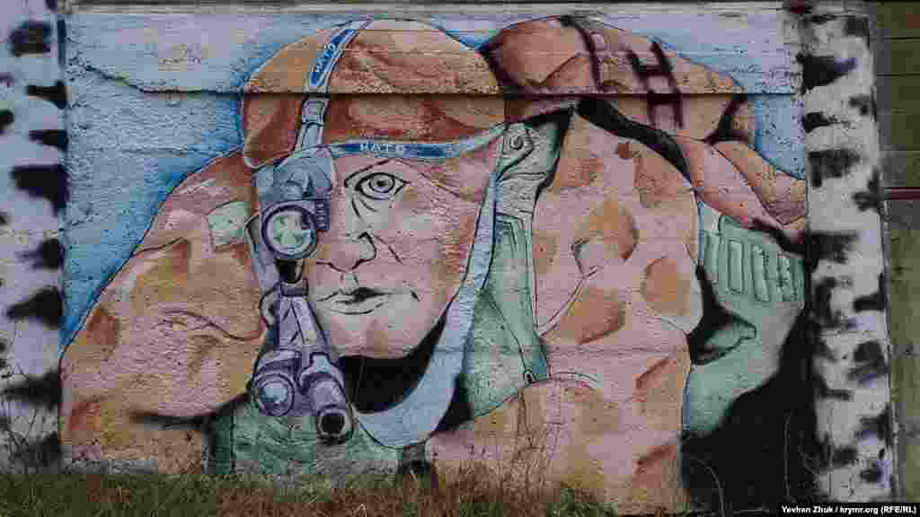 На одном из граффити в Севастополе изображен снайпер НАТО среди берез. По соседству с этим граффити нарисован еще один настенный рисунок, изображающий американского солдата, стоящего также среди берез.