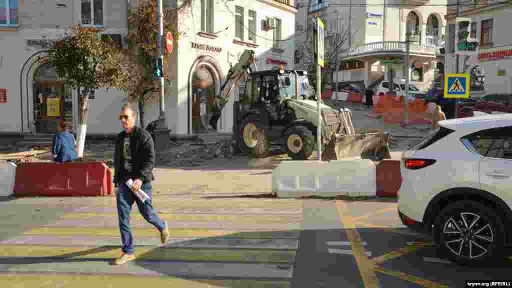 Для ускорения ремонтных работ был закрыт оживленный пешеходный переход на пересечении улиц Большая Морская, Суворова и адмирала Октябрьского. Горы выкопанного грунта стали обычным явлением на тротуарах в центре Севастополя. Глубокие ямы в одних местах оградили бетонными блоками, а в других – тонкими строительными ленточками.