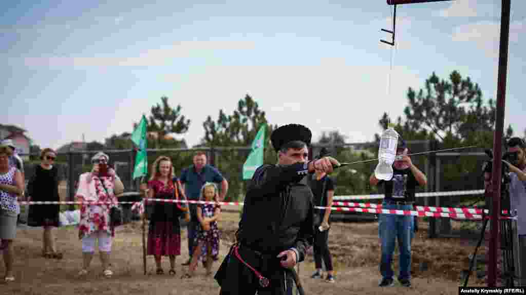 Первый фестиваль казачьей культуры «Крымские тулумбасы» состоялся в долине Красных пещер в 2012 году. После аннексии полуострова Россией в 2014 году мероприятие сделало заметный крен в военно-прикладную сторону. Очередной фестиваль 9 сентября в курортной Николаевке Симферопольского района – яркое тому подтверждение. Хотя на нынешний «Крымских тулумбасах» были и народные песни, и выставка работ умельцев, и приготовление кулеша, и верховая езда на лошади. Кроме того, прошло соревнование по рубке шашкой, причем, под «аккомпанемент» очередей из «электронного» автомата Калашникова. По словам участников, гостей мероприятия было меньше, чем в прежние годы.