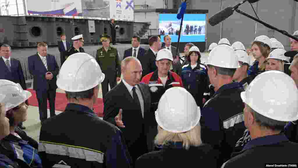 Владимир Путин в аннексированном Крыму: президент России 20 июля прибыл с визитом в Керчь. Там, на территории судостроительного завода «Залив», проходила церемония закладки кораблей Военно-морского флота России.