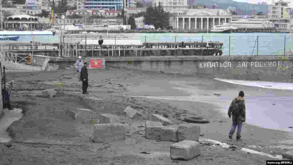 6 февраля в Ялте волнение моря достигает четырех баллов, на нижней набережной в районе часовни прибой образовал песчаные заносы и растащил защитный бордюр из бетонных блоков.