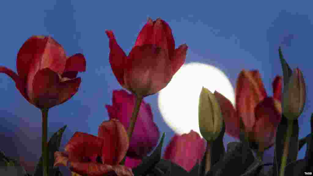 Вид на полнолуние сквозь тюльпаны. Село Клиновка Симферопольского района Крыма.