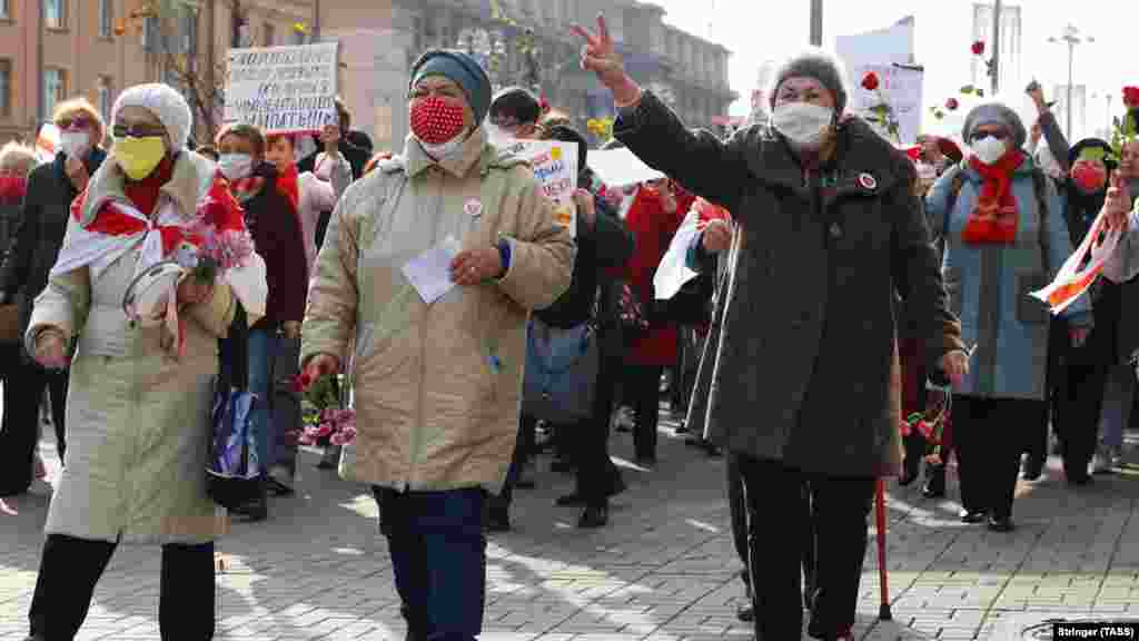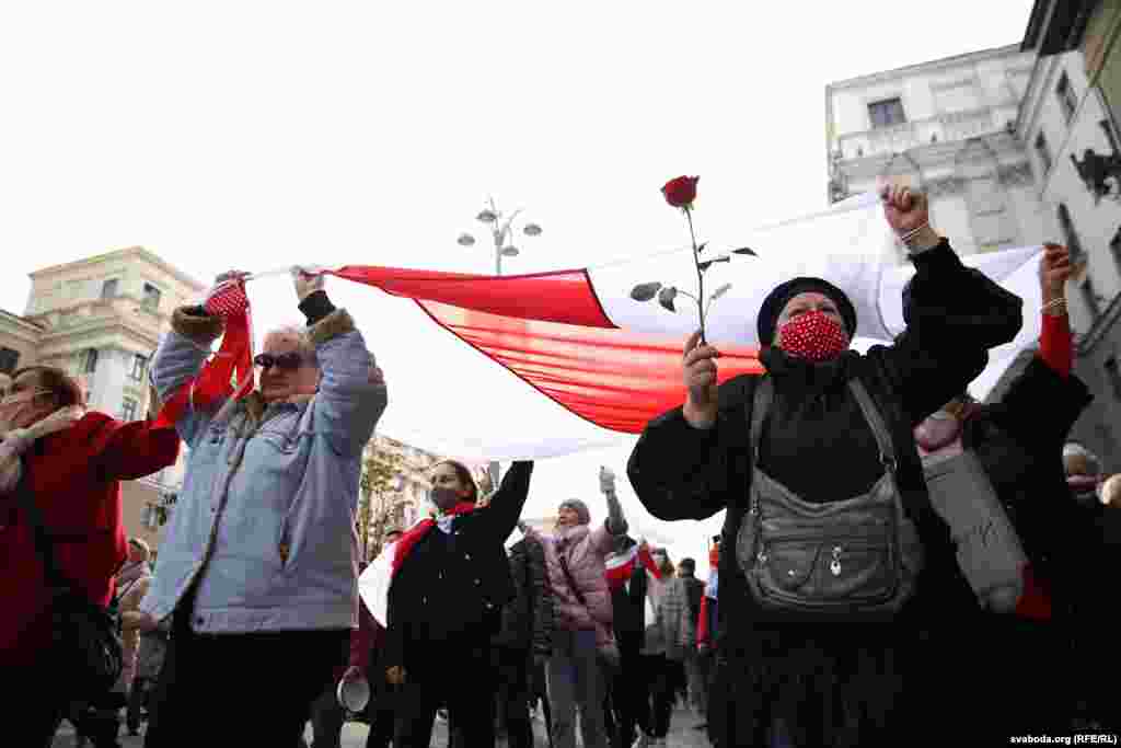 Уже традиционно по понедельникам на минской площади Независимости у костела Святых Сымона и Алены пенсионеры собрались на марш. Колонной они прошли по проспекту Независимости. К шествию присоединялись прохожие всех возрастов. Среди них много студентов, которые с утра вышли на акции протеста и поддержали всеобщую забастовку.