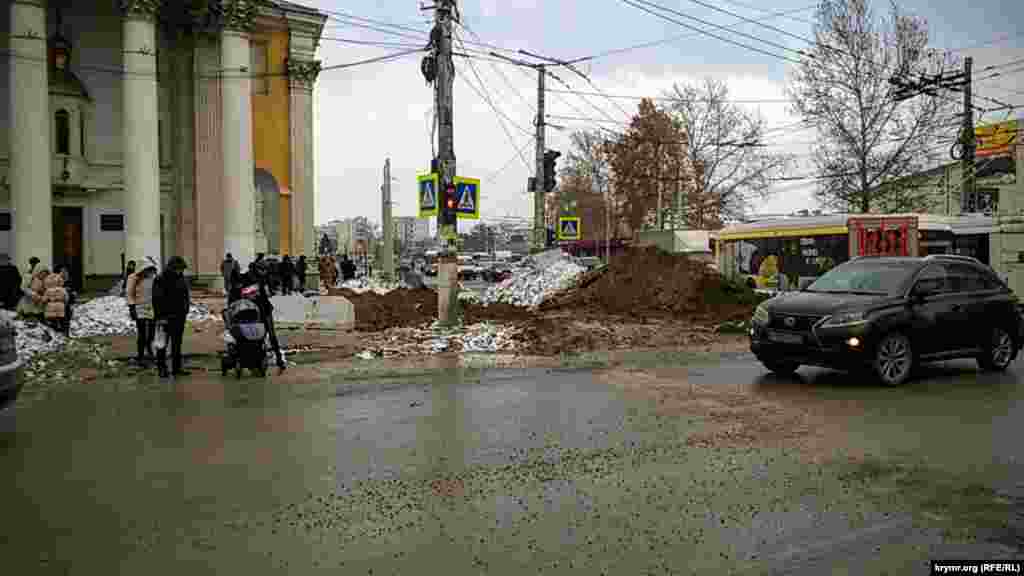 Недоделанный участок дороги на улице Севастопольской. Пассажиры лавируют по бездорожью