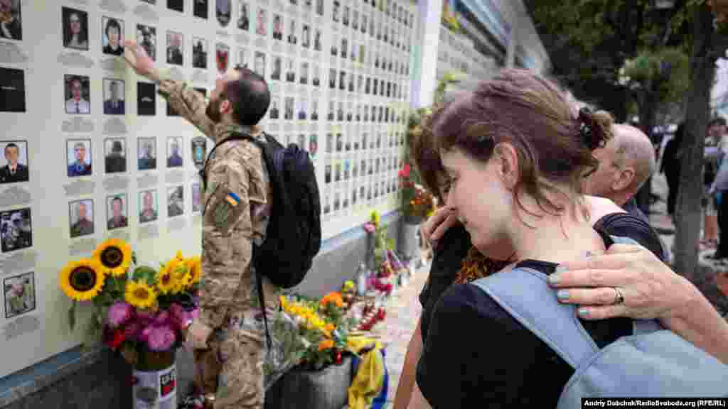 29 августа – День памяти погибших за свободу Украины. На Михайловской площади в Киеве собрались несколько сотен людей: семьи погибших героев, их собратья, друзья, представители общественных организаций. Прошла минута молчания и Всеукраинский молебен по погибшим в Донбассе. Сегодня на Стене памяти у Михайловского собора – 3905 фотографий погибших бойцов.