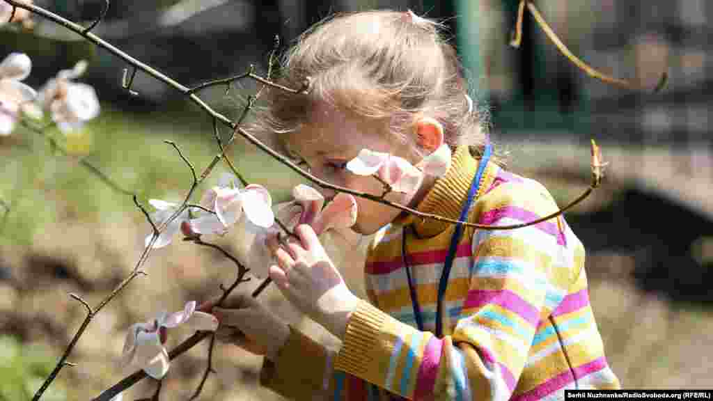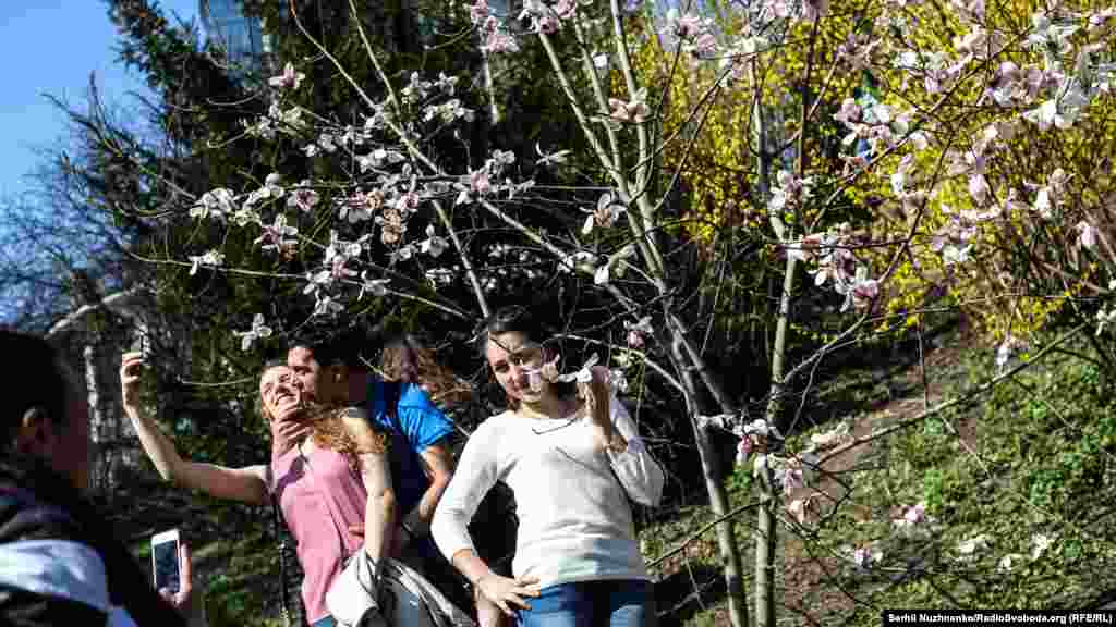 В киевском ботаническом саду имени Фомина расцвели магнолии. Пока цветы появились лишь на трех деревьях, цветение остальных магнолий ожидается во второй половине апреля. Посетители сада наслаждаются ароматом, делают «Селфи» на фоне кустов, а художники рисуют пейзажи с цветущими деревьями прямо с натуры. Но, к сожалению, не все посетители заботливо относятся к цветам. Время от времени на земле у магнолий появляются оборванные лепестки.