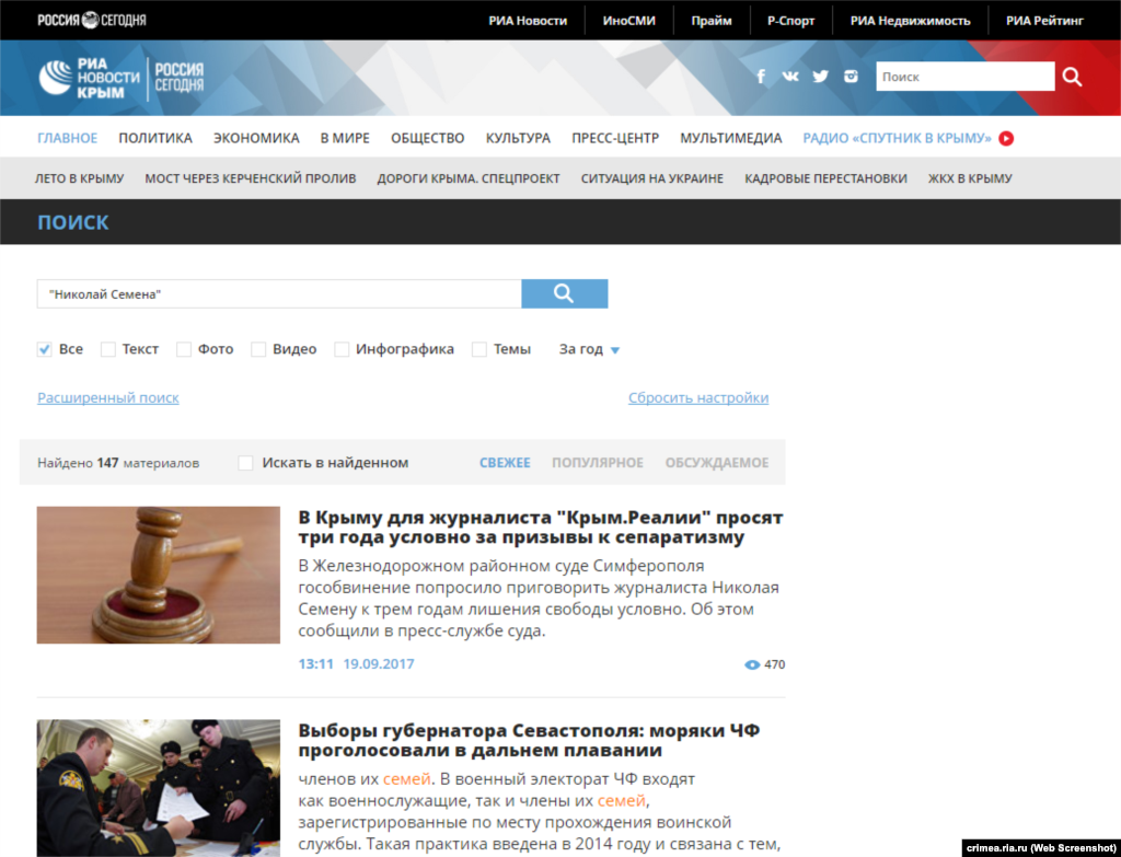 Ведущие крымские СМИ, в разное время упоминавшие Николая Семену, но проигнорировавшие судебный приговор по его делу.