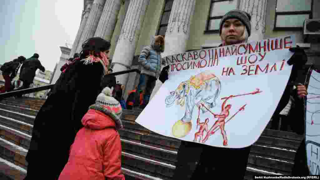 27 января в Киеве, возле здания Национального цирка Украины, около сотни активистов провели акцию против использования животных в цирковых представлениях. Активисты с плакатами и фотографиями животных в цирковых клетках требовали прекратить использовать животных в цирковых представлениях.