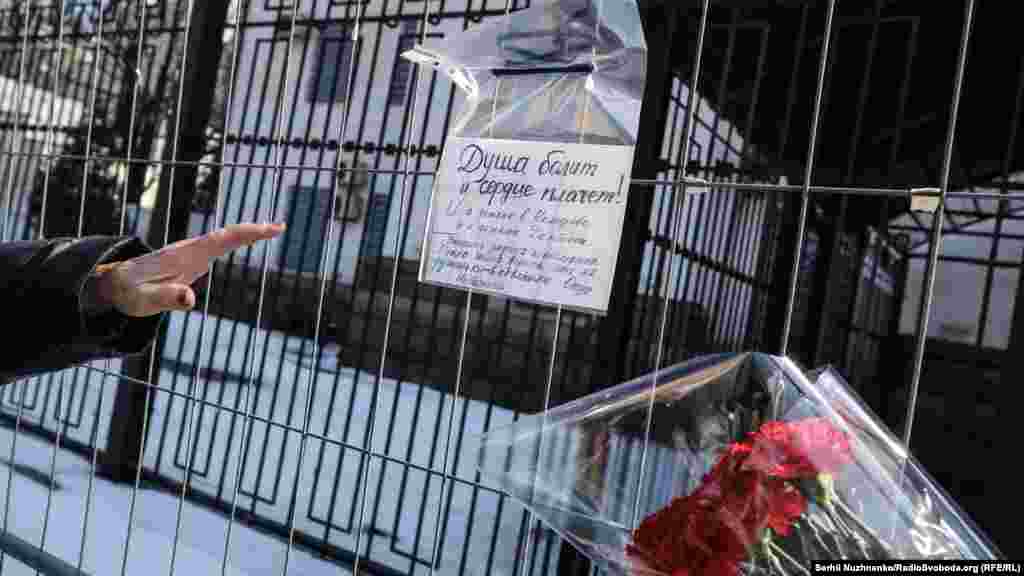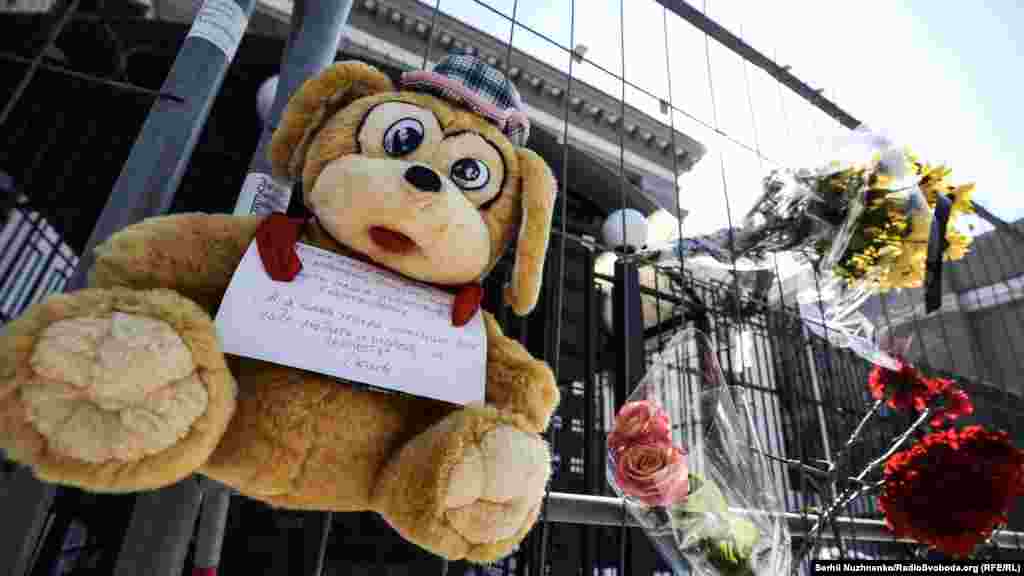 Киевляне несут цветы и игрушки к зданию посольства России в память погибших в трагедии.