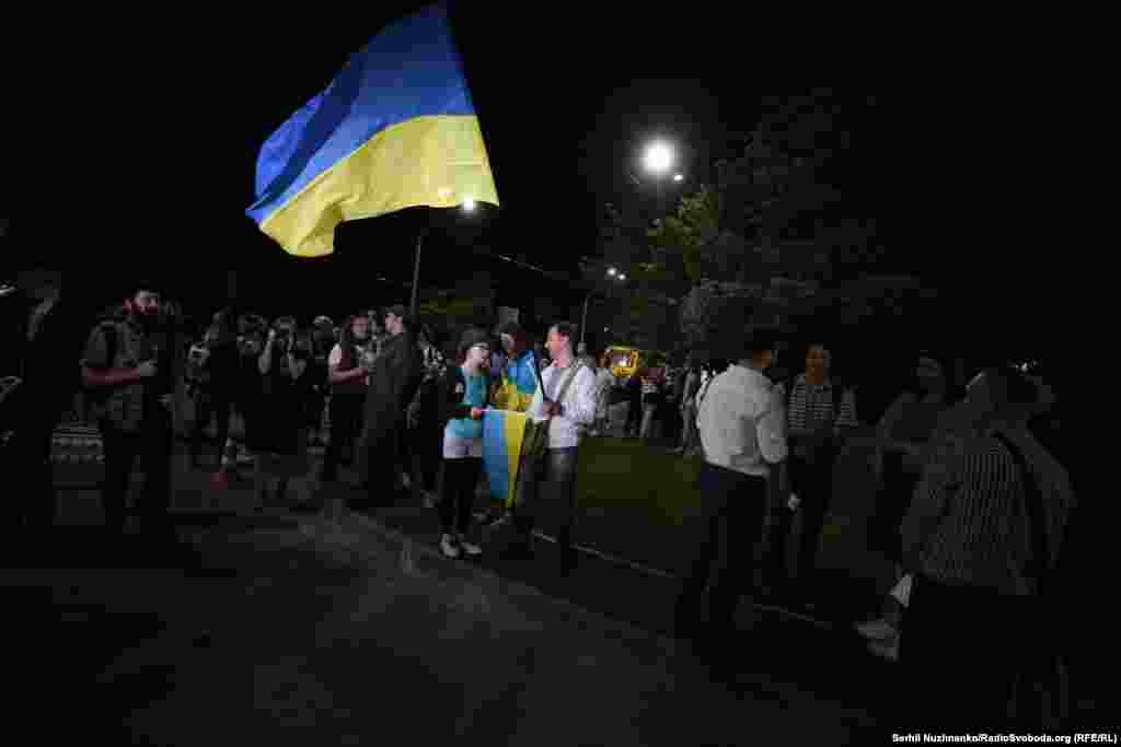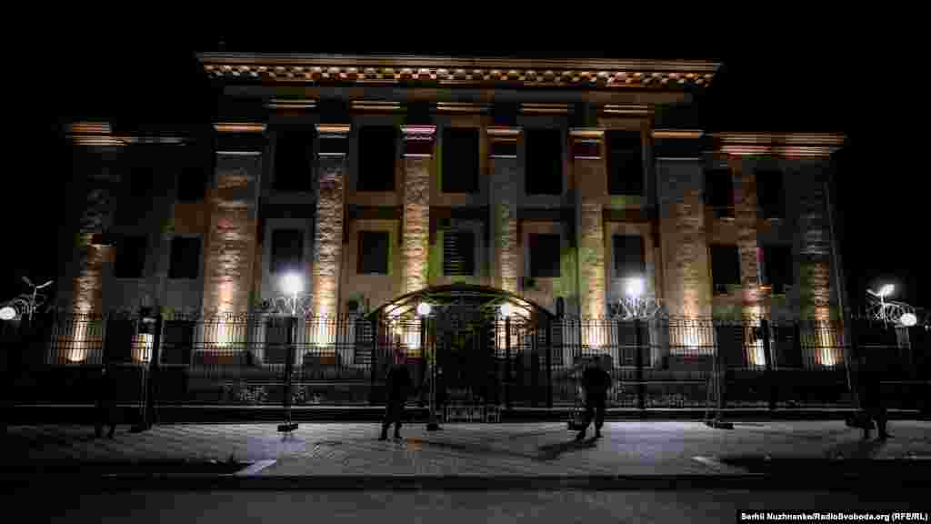 Здание посольства России в Украине в Киеве 25 мая подсветили языками пламени, изображением голодающего в России украинского режиссера Олега Сенцова и других политузников Кремля.