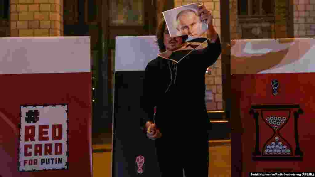 В рамках международной кампании #RedCardForPutin поздно вечером в понедельник 16 июля в Киеве прошла акция-перформанс «БАНДЕРоль для Путина».