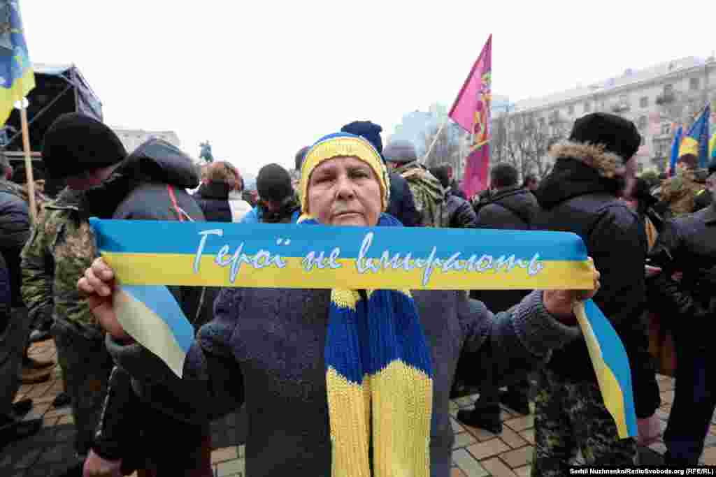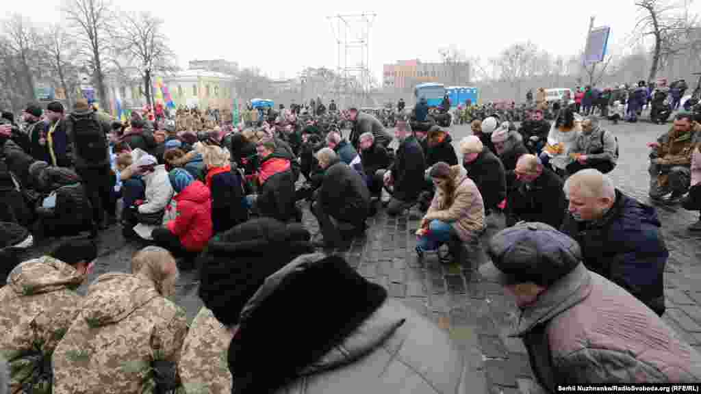 На центральной улице Киева собрались ветераны боевых действий на востоке Украины, участники обороны Дебальцевского плацдарма, чтобы маршем почтить вторую годовщину боев за Дебальцево