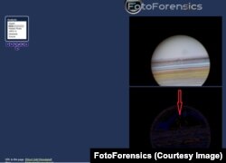 Проверка с помощью сервиса Fotoforensics, который позволяет распознавать фальшивые снимки, показала, что перед публикацией фото было уменьшено как минимум в половину от своего оригинального размера и содержит элементы дорисовок. То есть имеет признаки подделки.