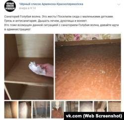 «Лагерь имени Гагарина, Евпатория! Здесь сумку страшно на пол положить, не говоря уже о ребенке, которому 1,9 лет! Питание рассчитано на детей от 7 до 16 лет! Напрашивается вопрос: что здесь делать детям нашего возраста?! Мы уехали от химии, а приехали в номера с тараканами, пылью, грязью, мусором, облеванными стенами, не говоря уже о постельном белье, состоянии мебели и комнаты в целом! Неужели мы заслуживаем такое отношение к себе!» – пишут жители Армянска в соцсети «Вконтакте».