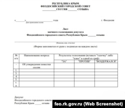 Таким образом феодосийские депутаты уже несколько месяцев голосуют в заочном режиме с помощью вот таких опросных листов.