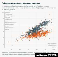 «Если выборы проводятся в свободной среде без нарушений, графическое представление полученных партиями голосов демонстрирует определенные закономерности, – сказал Роман Удот, аналитик данных и бывший политзаключенный в России. – Если проводить их в несвободной среде с нарушениями и различными манипуляциями, мы можем увидеть нарушения, отклонения и аномалии в графических данных. В Грузии мы видим именно такие отклонения».