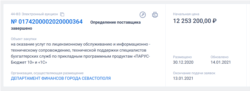 30 декабря департамент финансов Севастополя объявил тендер на «оказание услуг по лицензионному обслуживанию и информационно-техническому сопровождению, технической поддержки специалистов бухгалтерских служб по прикладным программным продуктам «ПАРУС-Бюджет 10» и «1С» с начальной ценой контракта 12 253 200 рублей.