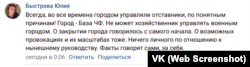 «Всегда, во все времена городом управляли отставники, по понятным причинам! Город - База ЧФ. Не может хозяйственник управлять военным городом», – выражает мнение Юля Быстрова. Хотя городом ни при СССР, ни во времена независимой Украины Севастополем отставные военные не руководили.