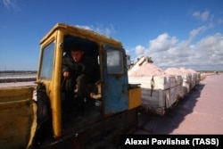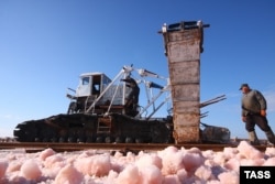 В советские времена тут работал целый промышленный комплекс. Сольпром был подразделением сакского химзавода, добыча шла в десяти бассейнах. В конце восьмидесятых ее сократили, теперь тут работает частное предприятие «Галит». В огороженные участки зимой заливают морскую воду – летом жидкость испаряется, а соль остается. Розовый цвет – это бета-каротин, которым соль насыщается от водорослей под названием Dunaliella Sallina.