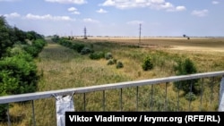 Дорога к селу пролегает через мост над Северо-Крымским каналом. За пять с лишним лет, прошедших с момента прекращения подачи воды с территории материковой Украины, канал зарос травой и кустарниками. Не понятно, были ли тут вообще плиты?