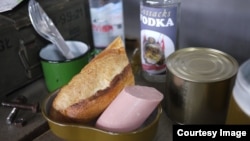 А вот так японцы реконструировали походный обед в советском стиле. Несмотря на любовь реконструкторов к деталям, здесь их работу сразу выдает минеральная вода Evian и диковинная "казацкая водка", которую можно встретить разве что в магазинчиках для экспатов с постсоветского пространства.